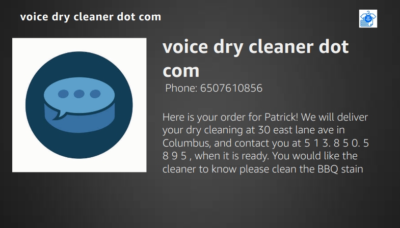VoiceDryCleaner.com — Is an AI platform that puts your dry cleaning business on Amazon Alexa quickly and easily.